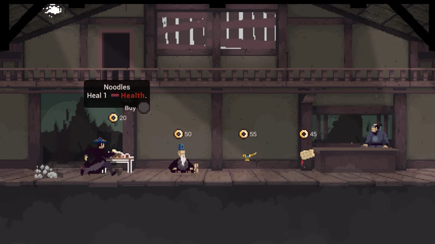 Каждый бой начинается в режиме Предвидения. Экран затягивает тьмой, время замирает – и вы можете экспериментировать: бить, уворачиваться, блокировать, пробовать разные комбинации. Никаких ограничений. Хотите проверить, что будет, если сначала выбить оружие у лучника, а потом использовать его против других? Делайте. Умерли? Сбросьте и начните заново. Только когда вы готовы, бой переходит в реальность – и там каждая ошибка может стоить жизни. Ю хрупкий, всего три очка здоровья, а исцеление – редкость. Один промах – и весь прогресс под угрозой.